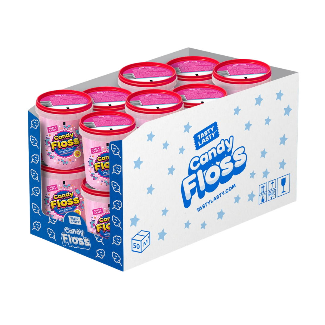 Candy Floss to wata cukrowa dostępna w 3 smakach: bananowym, truskawkowym oraz klasycznym. Produkt wyróżnia się praktycznym, sztywnym opakowaniem –zamykany, przezroczysty pojemnik pozwala cieszyć się smakiem na dłużej.